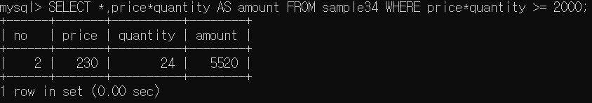 SELECT *,price*quantity AS amount FROM sample34 WHERE price*quantity >= 2000;