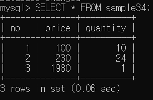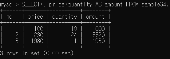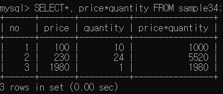 sample34에서는 price가 가격을, quantity가 수량을 의미한다. 따라서 금액을 계산하는 식은 price*quantity이며 SELECT 구로 계산할 수 있다.