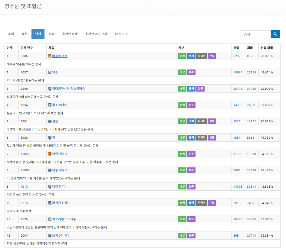 말 그대로 정수와 조합과 관련된 문제들의 모음이다. 정수론에서는 배수와 약수, 최대공약수, 최소공배수의 개념을 알고 있어야 하며 개념만 잘 이해하고 있다면 이를 코드로 만드는 것은 어렵지 않다. 조합론에서는 조합 즉 이항 계수에 대한 문제를 푼다. 이항 계수를 풀기 위해서 꼭 알고 있어야 할 개념인 팩토리얼과 이항 계수의 정의에 대해서 알고 있다면 정수론과 마찬가지로 어렵지 않다.