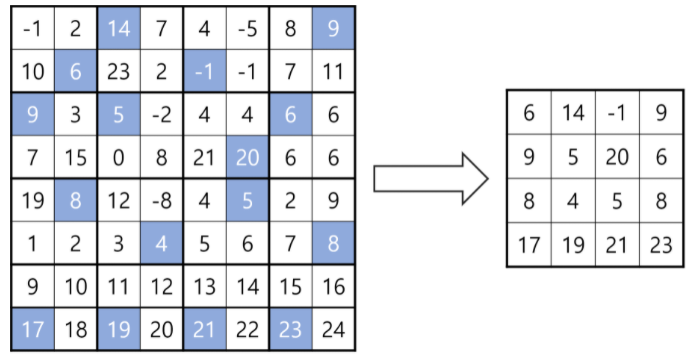조기 졸업을 꿈꾸는 종욱이는 요즘 핫한 딥러닝을 공부하던 중, 이미지 처리에 흔히 쓰이는 합성곱 신경망(Convolutional Neural Network, CNN)의 풀링 연산에 영감을 받아 자신만의 풀링을 만들고 이를 222-풀링이라 부르기로 했다. 다음은 8×8 행렬이 주어졌다고 가정했을 때 222-풀링을 1회 적용하는 과정을 설명한 것이다 1. 행렬을 2×2 정사각형으로 나눈다. 2. 각 정사각형에서 2번째로 큰 수만 남긴다. 여기서 2번째로 큰 수란, 정사각형의 네 원소를 크기순으로 a4 ≤ a3 ≤ a2 ≤ a1 라 했을 때, 원소 a2를 뜻한다. 3. 2번 과정에 의해 행렬의 크기가 줄어들게 된다.