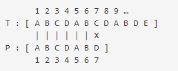 그러나 아래의 예에서 P는, T의 5번 문자에서 시작하는 매칭에 성공했다. T의 5~11번 문자와 P의 1~7번 문자가 서로 하나씩 대응되기 때문이다.