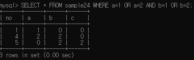 'SELECT * FROM sample24 WHERE a<>0 AND b<>0;' 결과와 다름을 알 수 있다. 왜 그럴까? 연산자의 우선순위가 다르기 때문이다.
