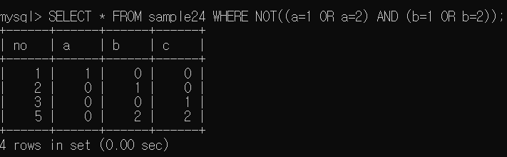 SELECT * FROM sample24 WHERE NOT((a=1 OR a=2) AND (b=1 OR b=2));