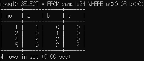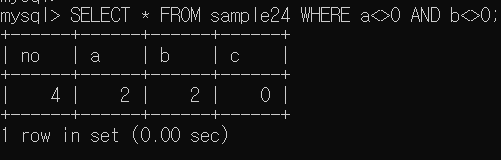 sample24 테이블에서 a열과 b열이 0이 아닌 행을 검색하는 경우를 생각해보자. a가 0이 아닌 조건은 'a<>0', b가 0이 아닌 조건은 'b<>0'이다. 이 두 조건은 AND로 조합한다.