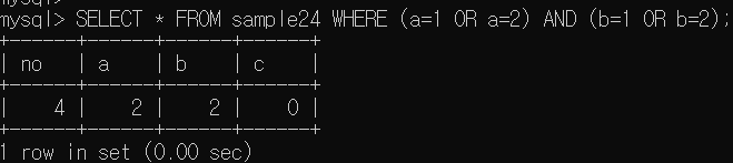SELECT * FROM sample24 WHERE (a=1 OR a=2) AND (b=1 OR b=2);
