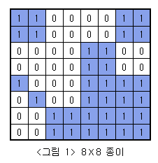 문제 아래 <그림 1>과 같이 여러개의 정사각형 칸들로 이루어진 정사각형 모양의 종이가 주어져 있고, 각 정사각형들은 하얀색으로 칠해져 있거나 파란색으로 칠해져 있다. 주어진 종이를 일정한 규칙에 따라 잘라서 다양한 크기를 가진 정사각형 모양의 하얀색 또는 파란색 색종이를 만들려고 한다.