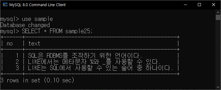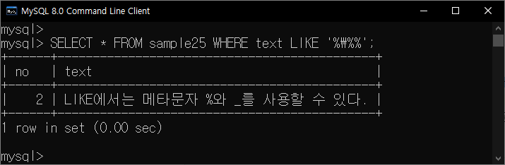 sample25의 두 번째 행은 메타 문자인 '%'와 '_'를 포함한다. 메타문자가 포함된 행을 메타문자로 검색하는 방법에 대해 알아보자. 메타 문자를 검색할 때는 WHERE에 들어가는 메타문자와 검색하고자 하는 메타문자를 구분할 필요가 있다. 만약 LIKE로 메타문자를 검색할때는 메타문자 앞에 '\'을 붙여 사용한다. 다음 조건은 '%'문자 앞뒤로 문자열이 오는 행을 의미한다.
