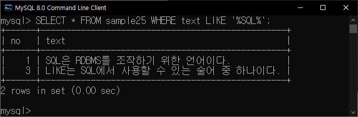 SELECT * FROM sample25 WHERE text LIKE '%SQL%';